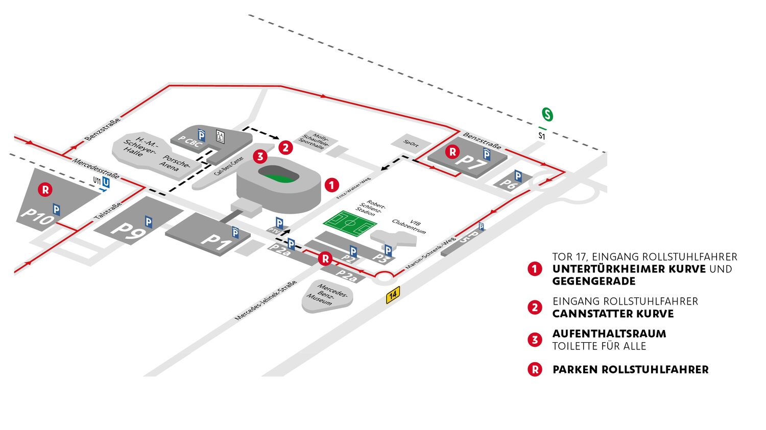 Entlang der Mercedesstraße und damit in unmittelbarer Nähe der MHP Arena Stuttgart befinden sich die insgesamt drei Behindertenparkplätze P7, P2a und P10. Somit sind kurze Wege bei der Anreise ins Stadion garantiert. Im Parkhaus P7 befinden sich insgesamt 100 Plätze, weitere 80 Parkplätze gibt es auf P2a zwischen MHP Arena Stuttgart und VfB-Geschäftsstelle.